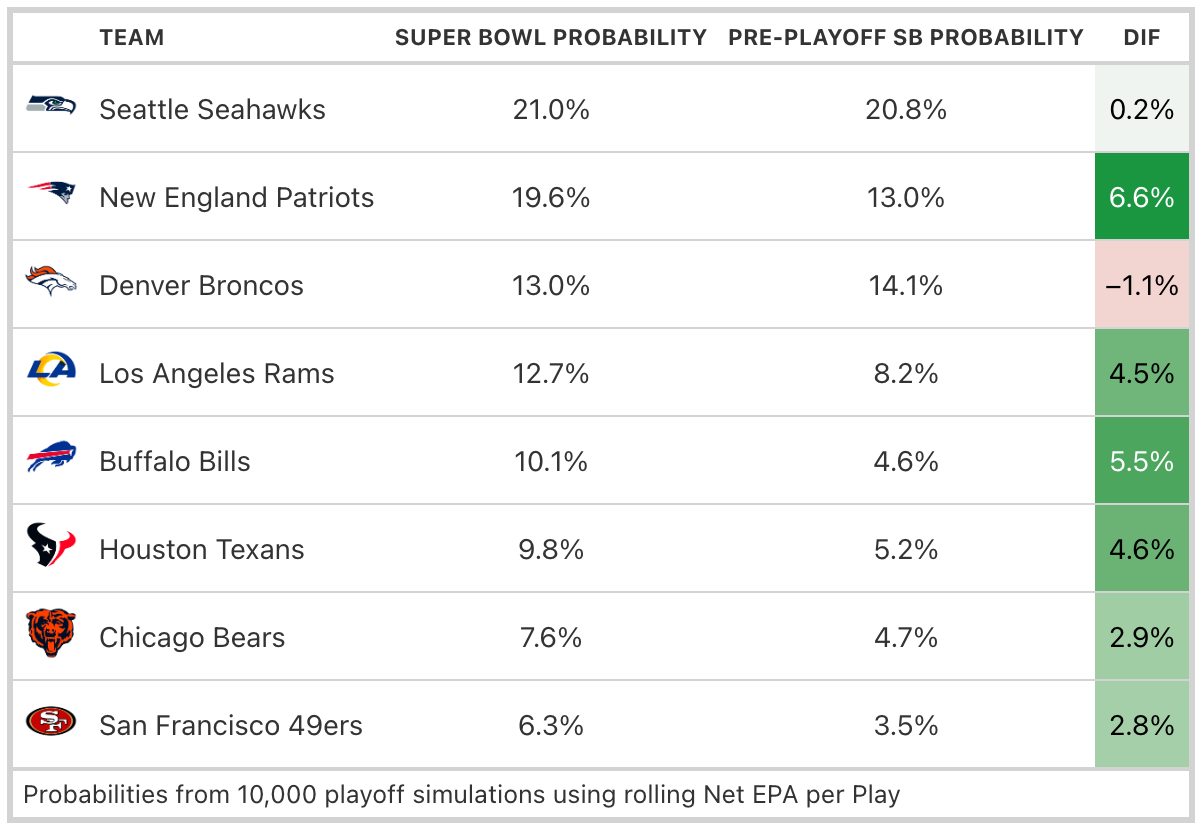 Seattle still owns the highest Super Bowl probability, but the gap has narrowed. Most notably, the Rams’ chances have jumped to nearly 13%. I think the model underrated Los Angeles heading into the Wild Card round due to how heavily it weights home-field advantage, and I’m not convinced it has fully corrected for that yet.